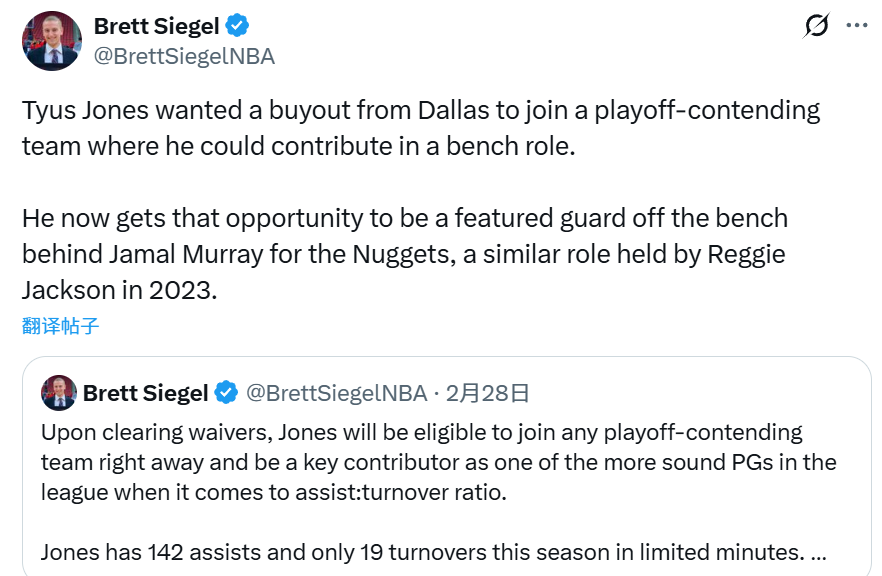 名记Siegel跟进报道称,琼斯与独行侠达成买断,是想加盟一支具备季后赛竞争力的球队,并在球队中担任替补贡献者。如今他得到了这样的机会 —— 将在掘金担任贾马尔-穆雷身后的主要替补后卫,这与2023年雷吉-杰克逊在掘金的角色相似。