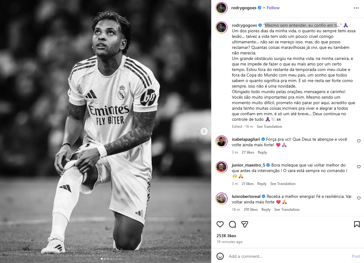 感谢所有人的祈祷、留言和关心!你们对我来说非常重要。尽管这是一个非常艰难的时刻,但我承诺不会就此停下。我相信自己的人生中还会有很多精彩的事情,也会继续为所有信任我的人带来快乐。这不是告别,只是暂时离开……一切仍在上帝的掌控之中。🙏🏾🤍🇧🇷