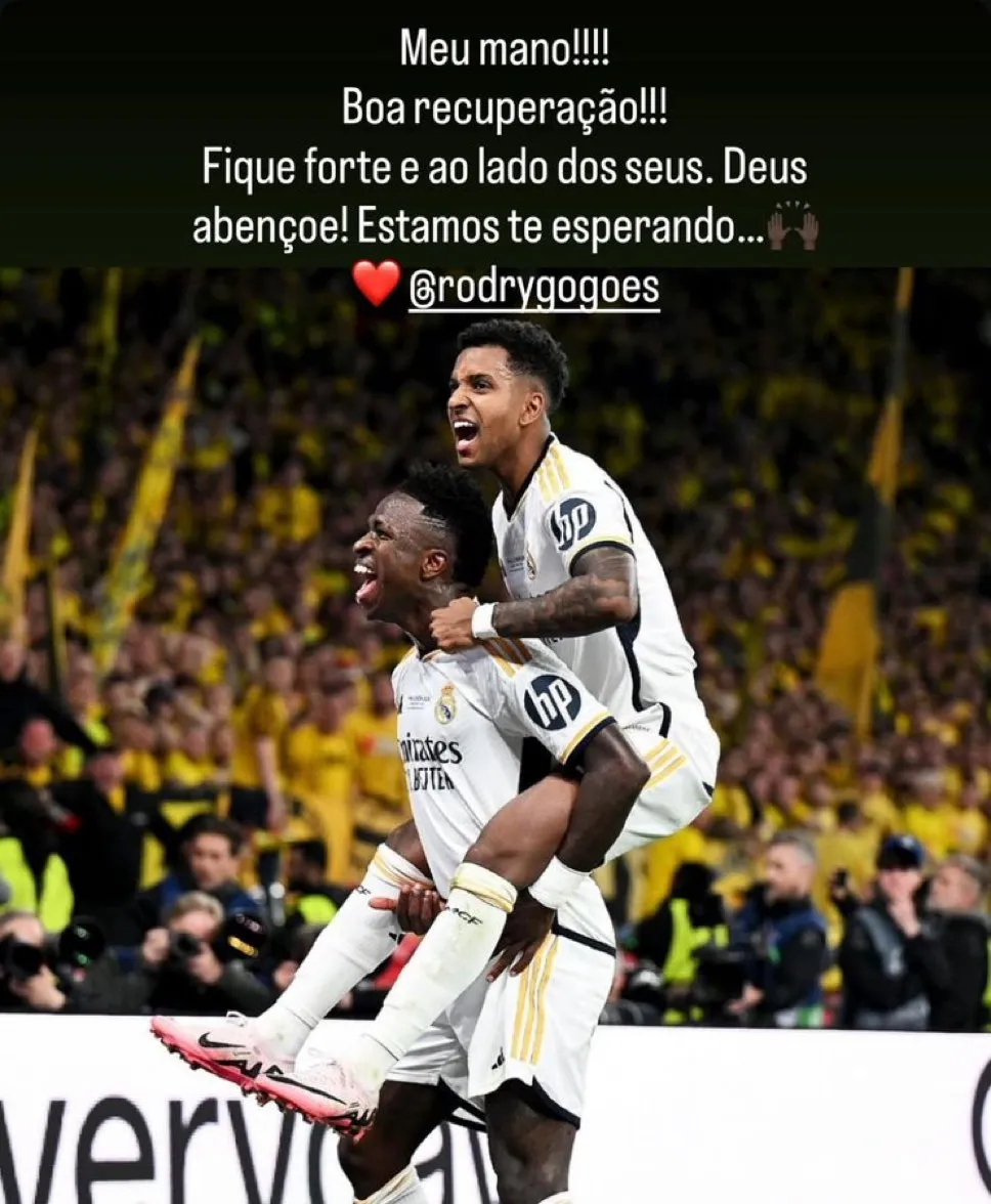 皇马前锋维尼修斯也发文安慰了罗德里戈。他写到:“我的兄弟,祝你早日康复。坚强起来,多和家人待在一起。上帝保佑你。我们都在等你。”